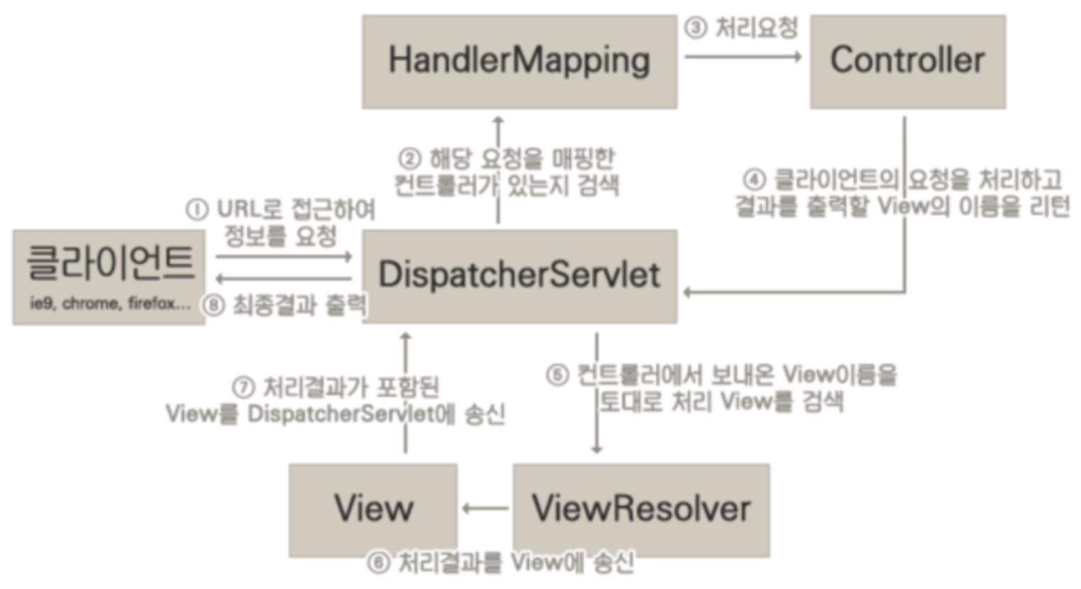 - 보내다 라는 의미를 포함하고 있는 Dispatcher Servlet 은 HTTP 프로토콜로 들어오는 모든 요청을 가장 먼저 받아 적합한 컨트롤러에 보내주는 Front Controller 이다. - Dispatcher Servlet은 해당 어플리케이션으로 들어오는 모든 요청을 핸들링 해주기 때문에, 우리는 컨트롤러를 구현해두기만 하면 Dispatcher Servlet가 알아서 적합한 컨트롤러로 위임을 해주는 구조가 된다. 1. 클라이언트가 URL 로 접근하여 정보요청. 2. DispacherServelt이 해당 요청을 매핑한 컨트롤러가 있는지 검색. 3. HandlerMapping 에서 해당 Controller로 처리 요청 4. Controller 가 View (*클라이언트의 요청을 처리하고 결과를 출..